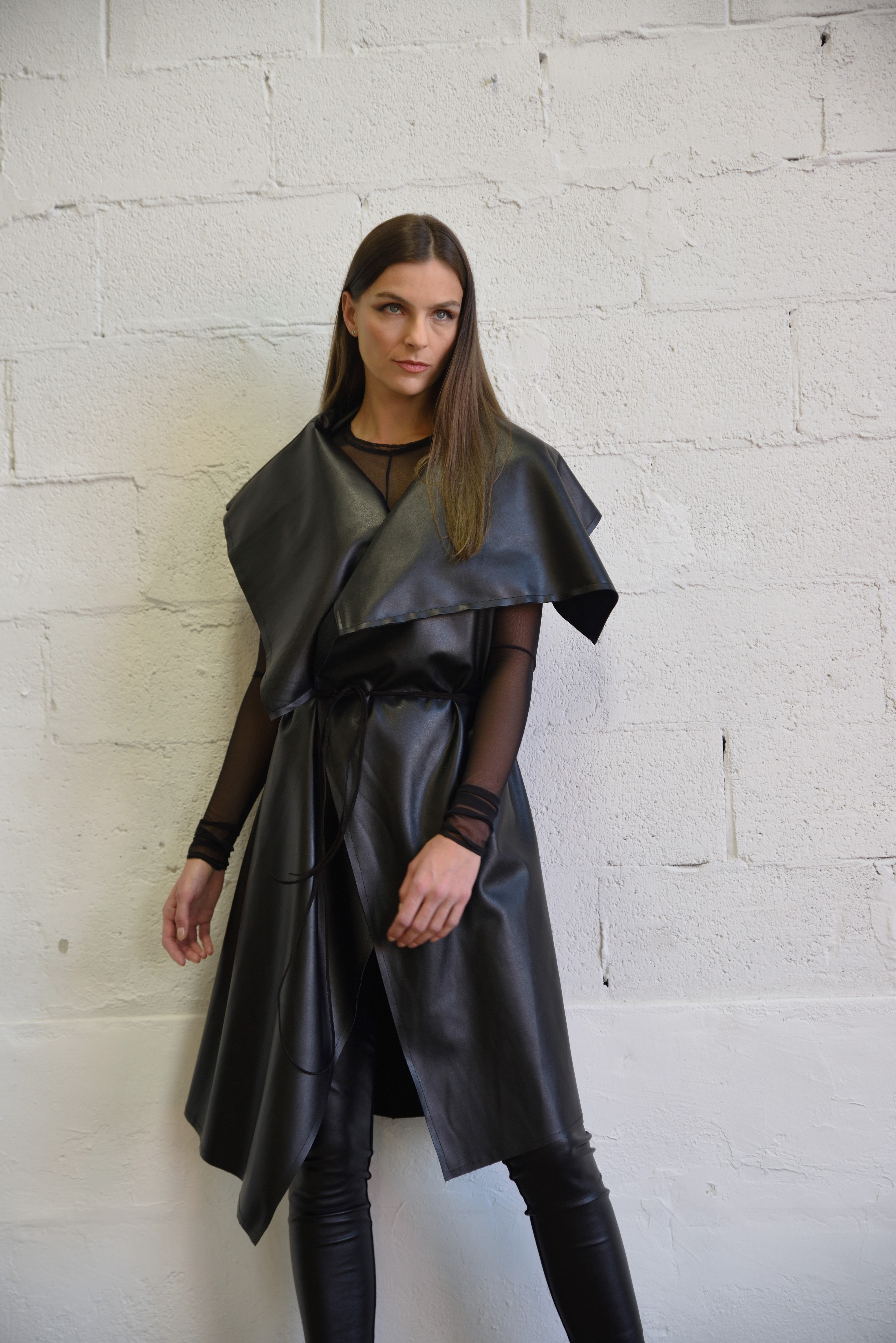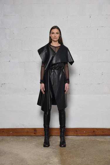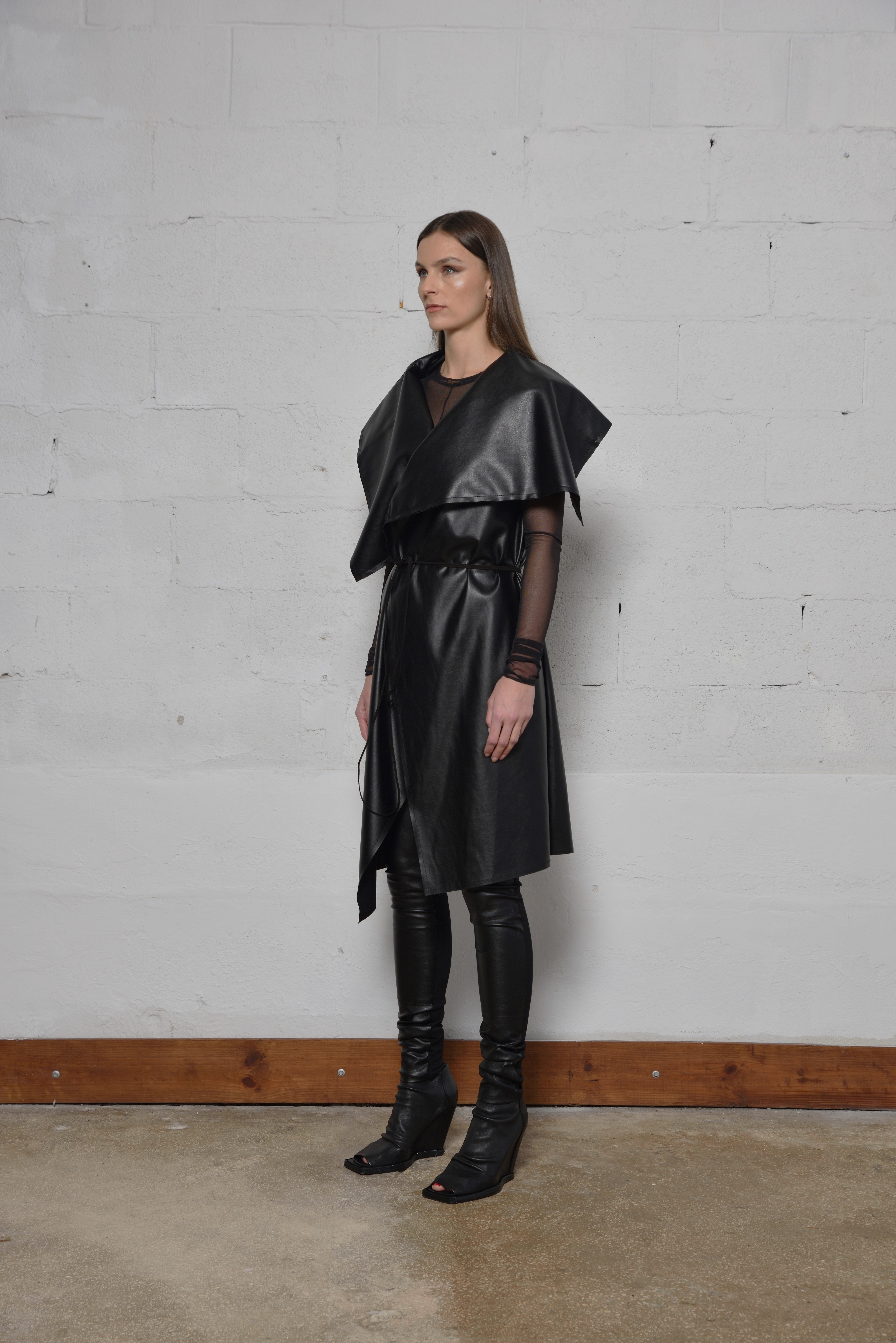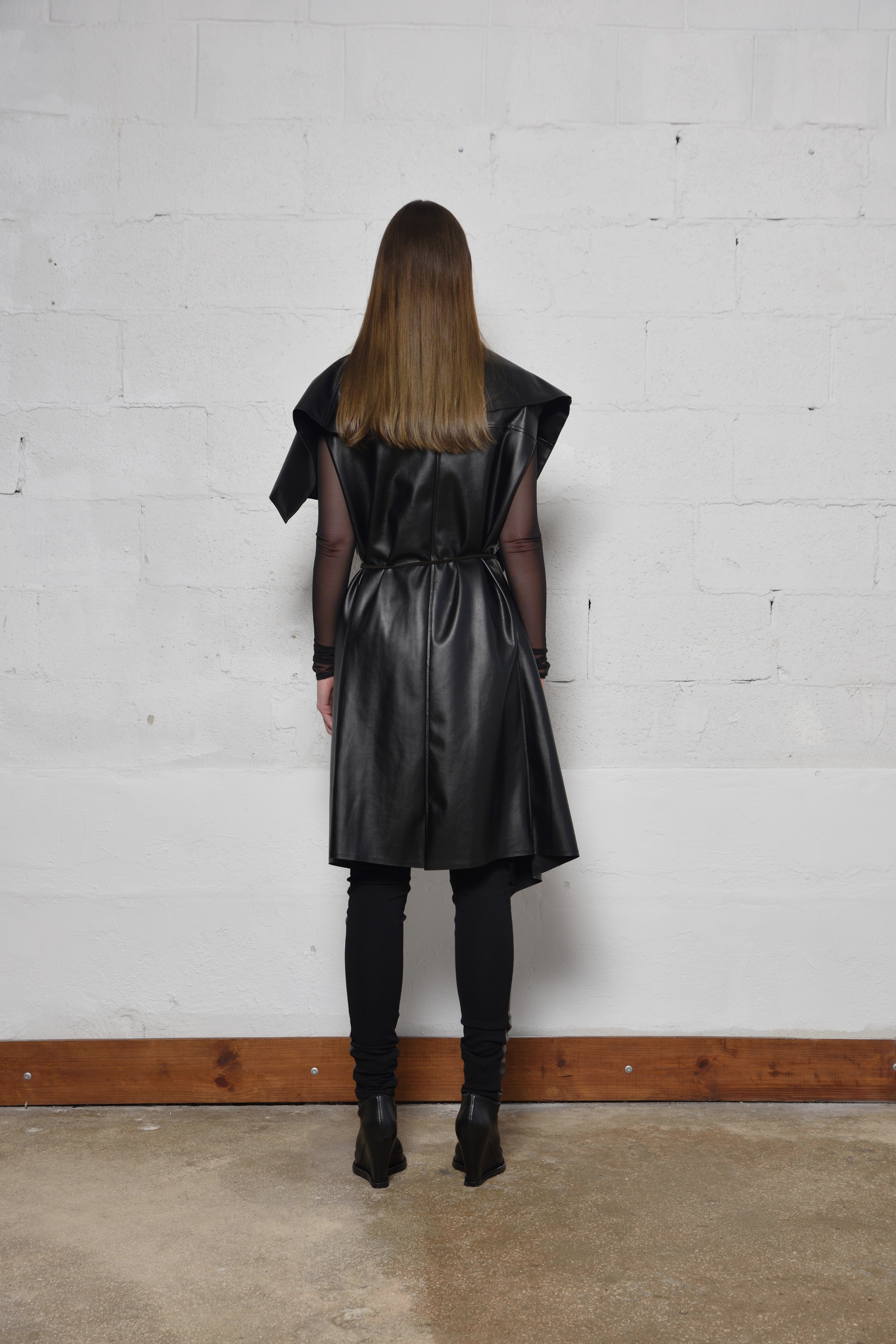 Command attention in this architectural, avant-garde outer layer. Crafted from supple vegan leather, the Uneven Sleeveless Coat redefines modern elegance with its asymmetric draped collar and flowing silhouette. The wide, sculptural lapel and cinched waist create a dramatic shape that flatters while making a bold statement.