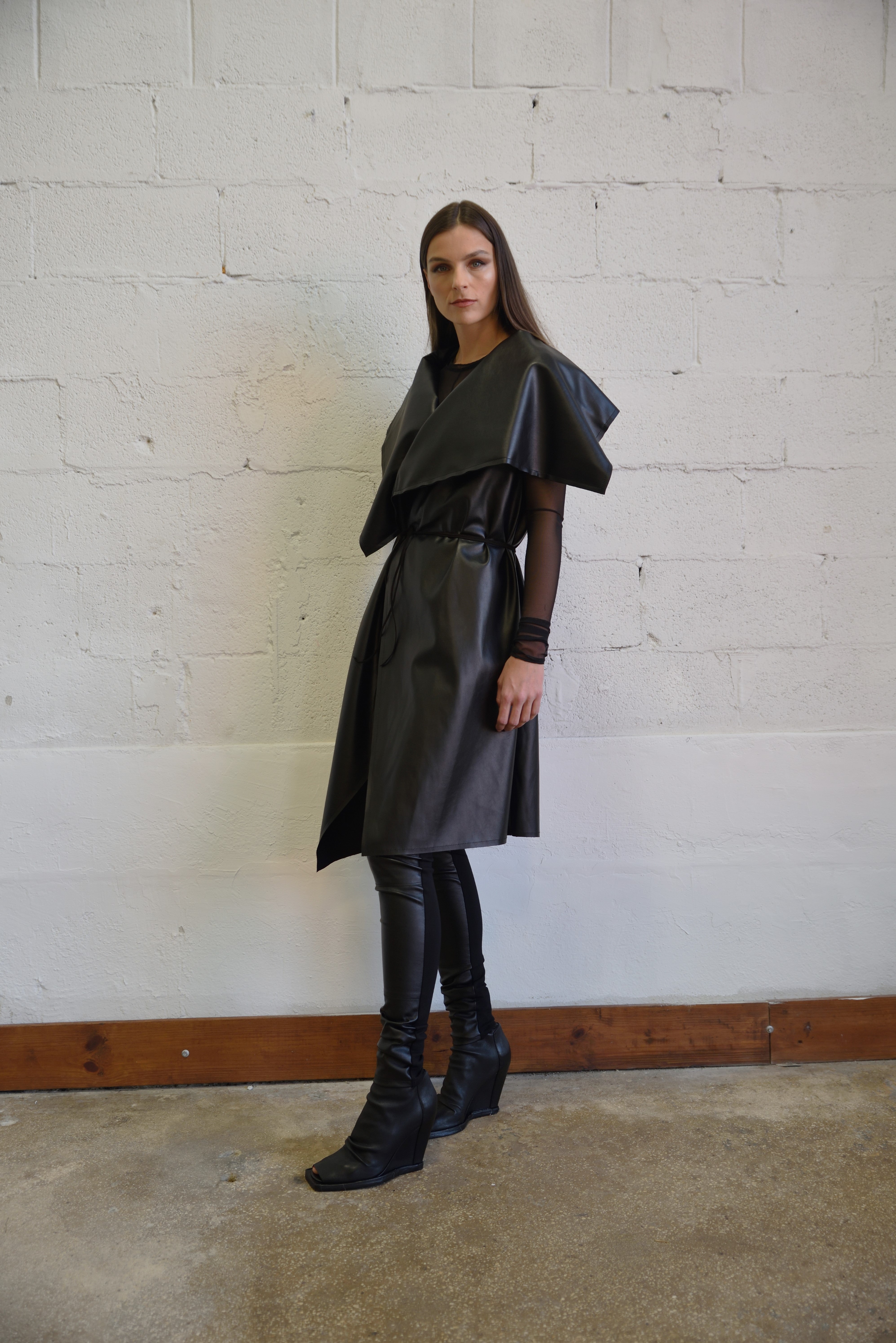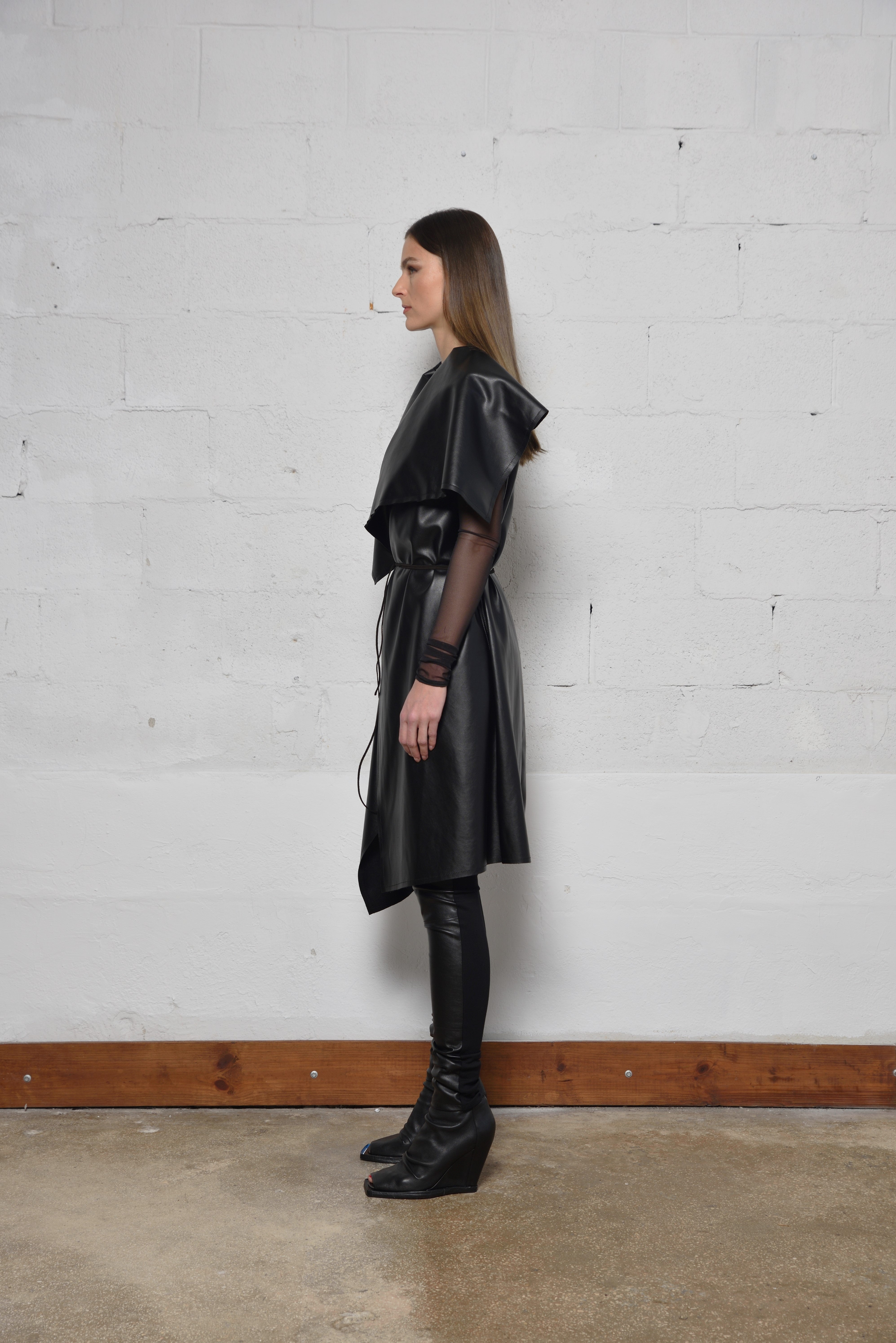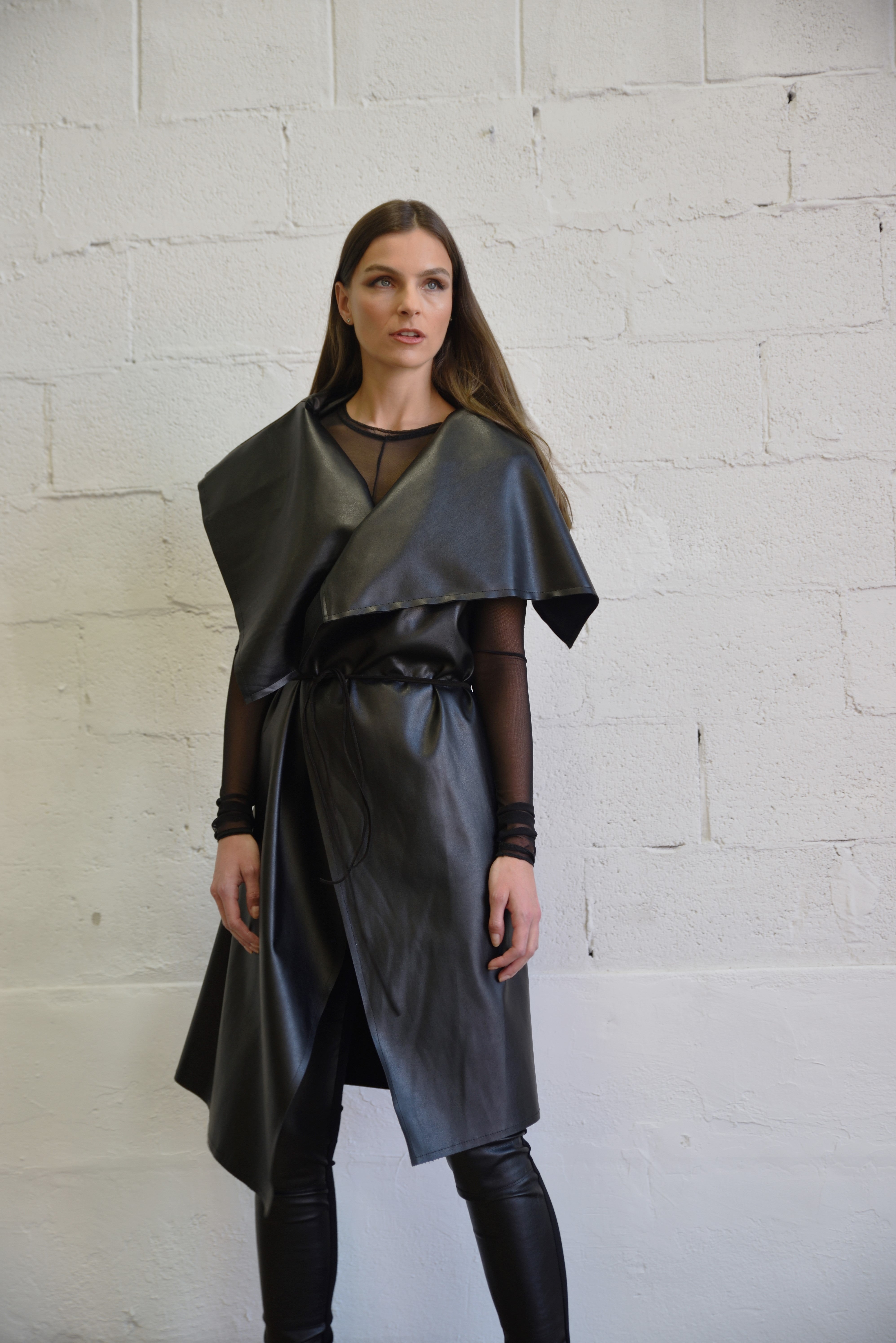 Command attention in this architectural, avant-garde outer layer. Crafted from supple vegan leather, the Uneven Sleeveless Coat redefines modern elegance with its asymmetric draped collar and flowing silhouette. The wide, sculptural lapel and cinched waist create a dramatic shape that flatters while making a bold statement.