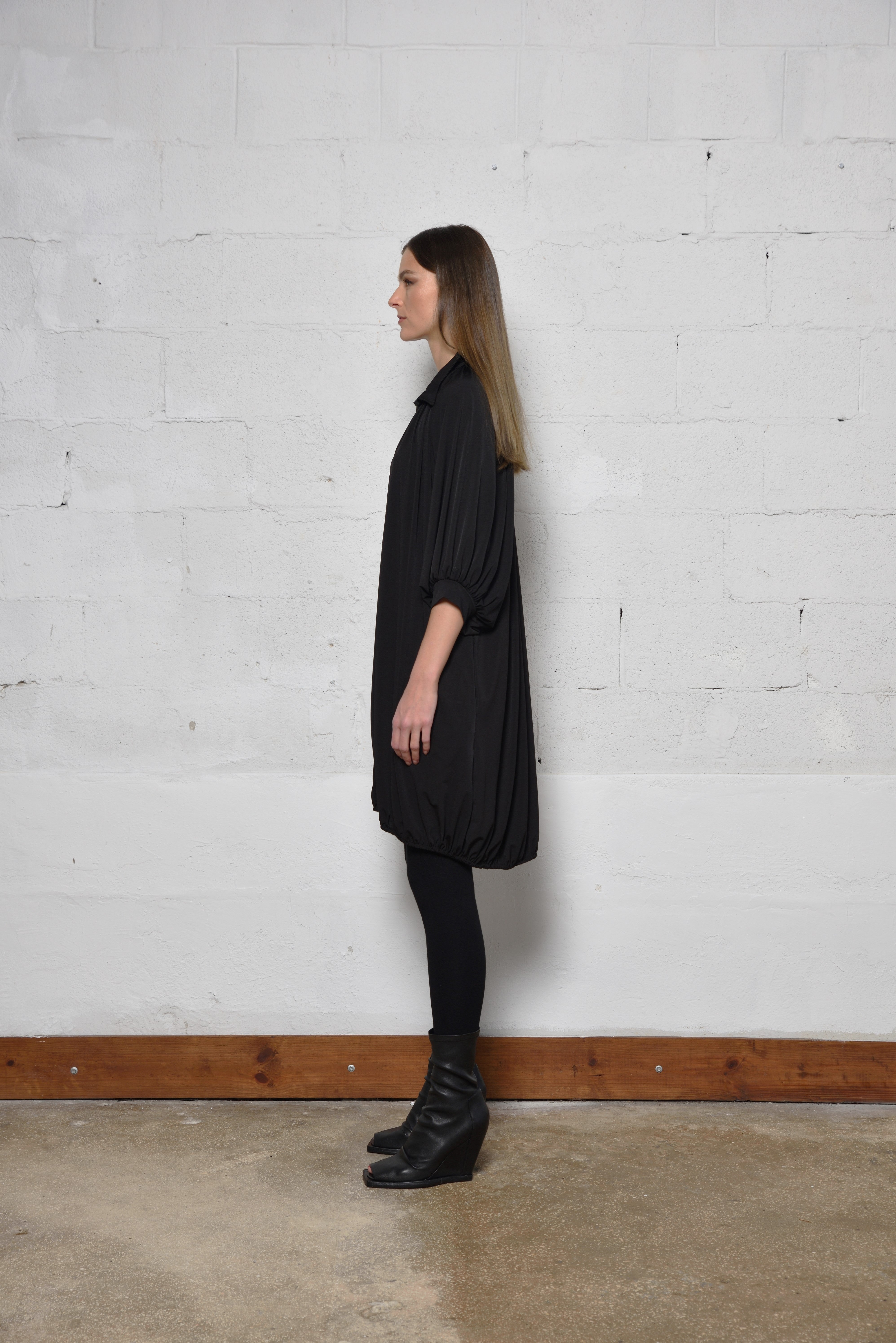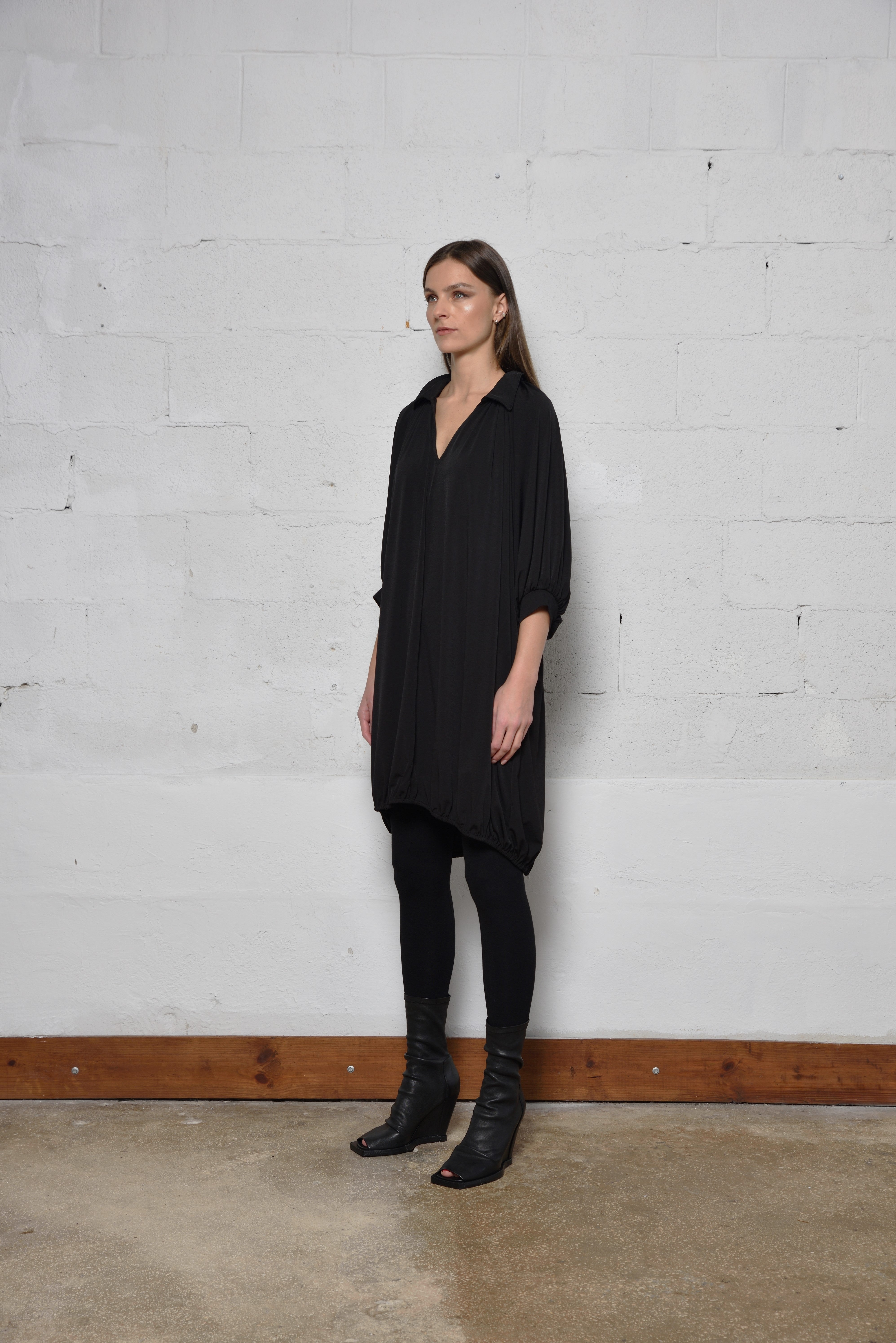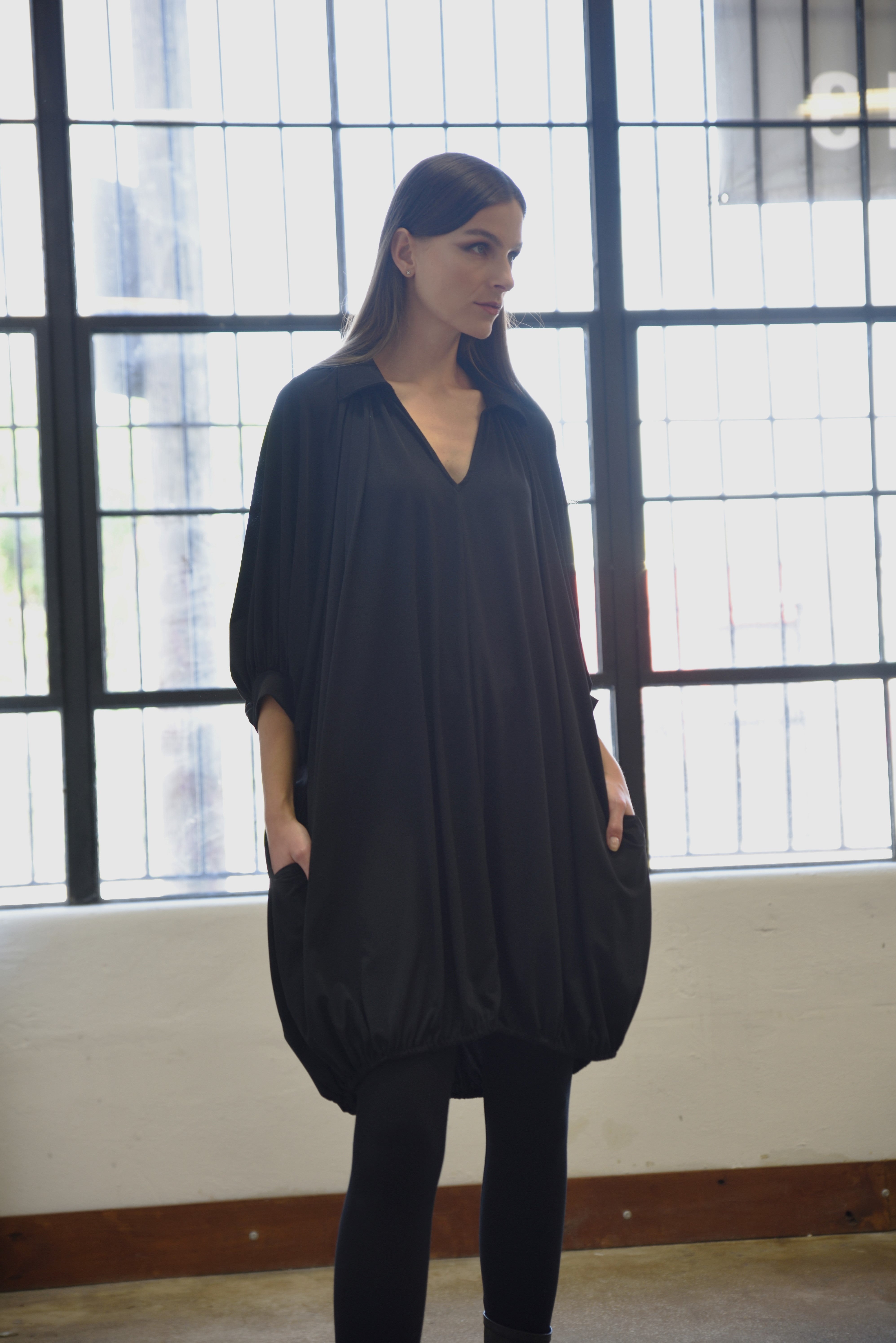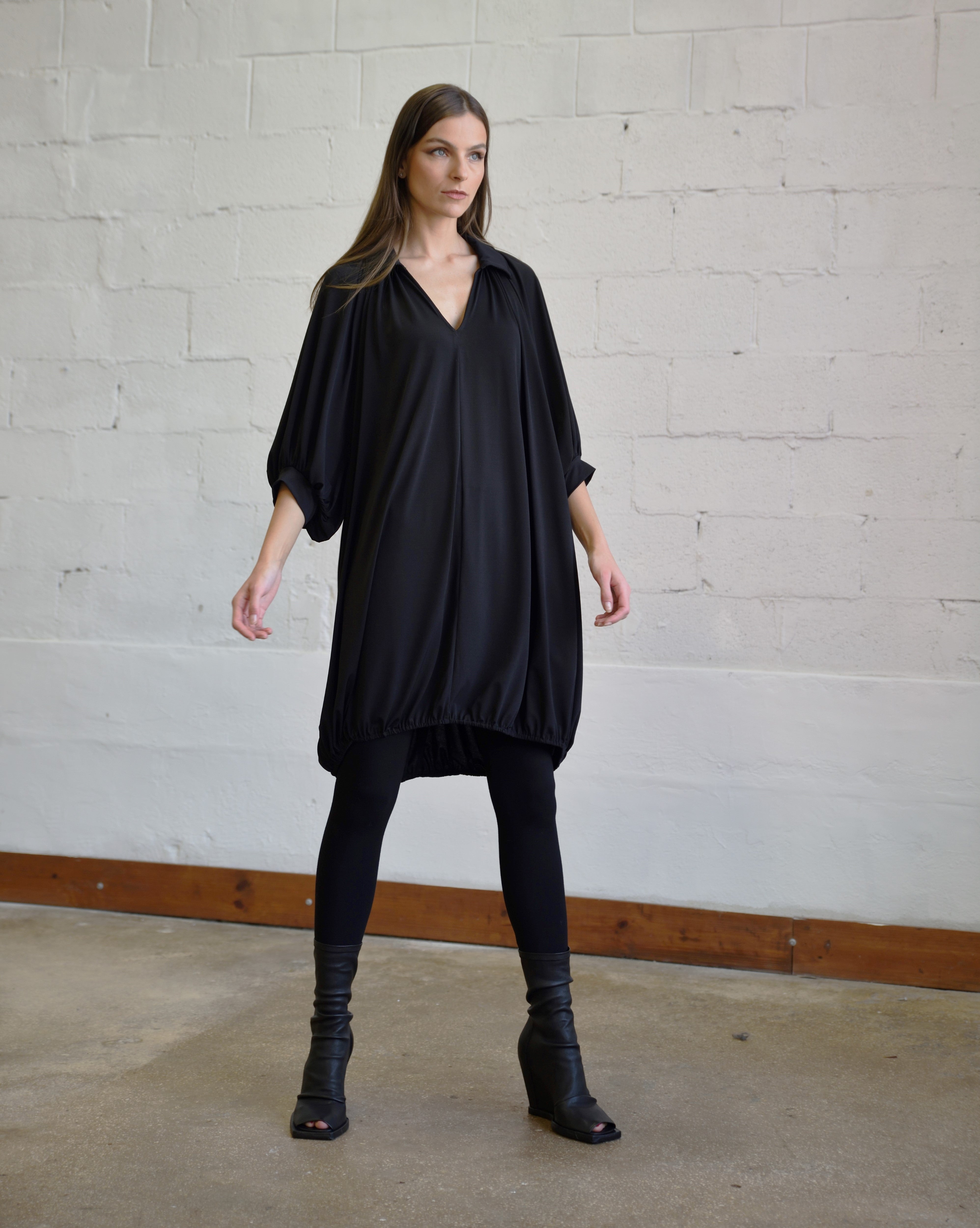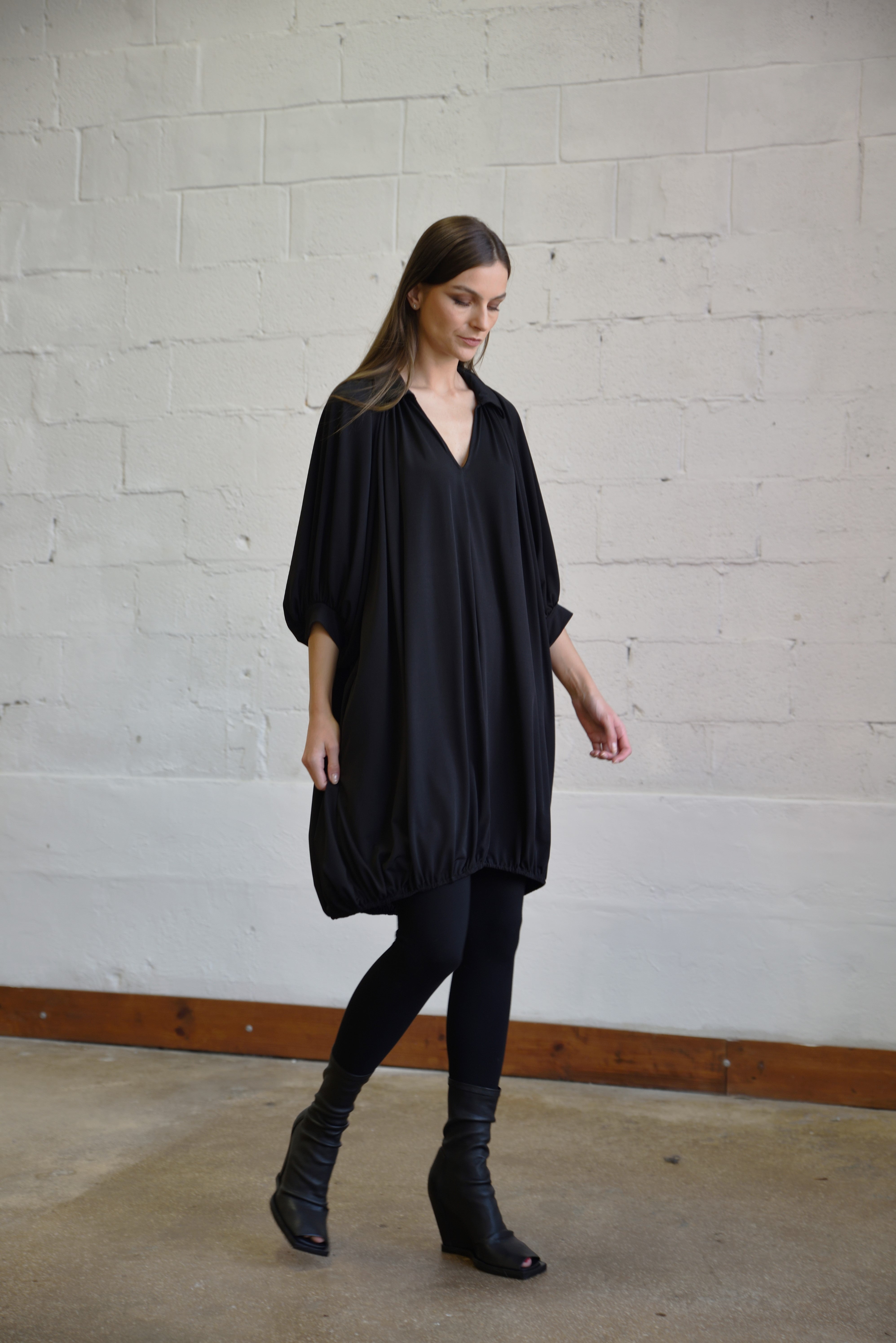 Crafted from a fluid, lightweight fabric, this dress moves with grace and comfort. A deep V-neckline and soft collar lend a polished edge, while the dropped shoulders and 3/4-length balloon sleeves add effortless volume. Side pockets offer functionality without compromising style.
