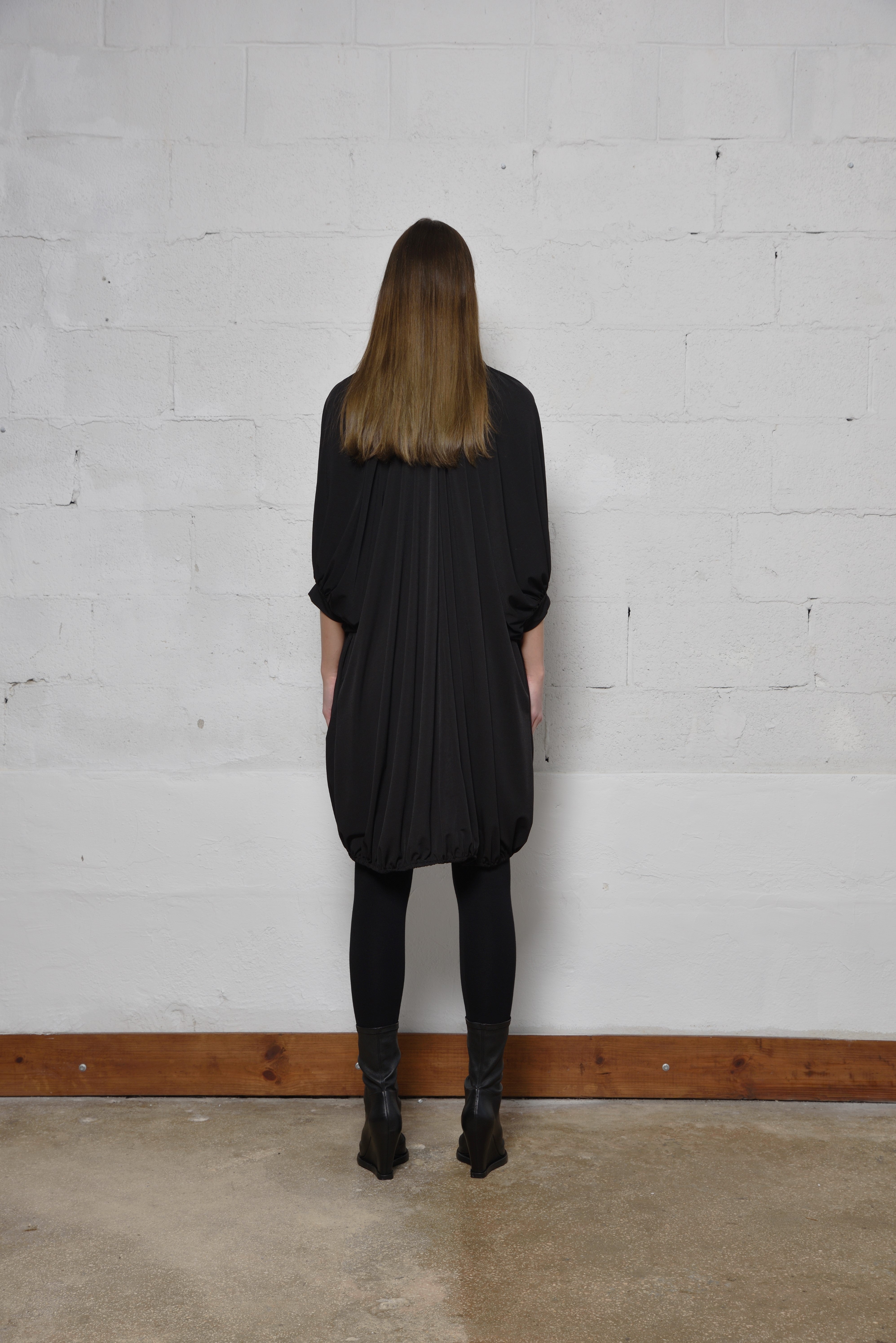 Designed for the modern minimalist, this statement piece features a voluminous cocoon silhouette with soft pleating and a gathered hem that drapes effortlessly around the body.