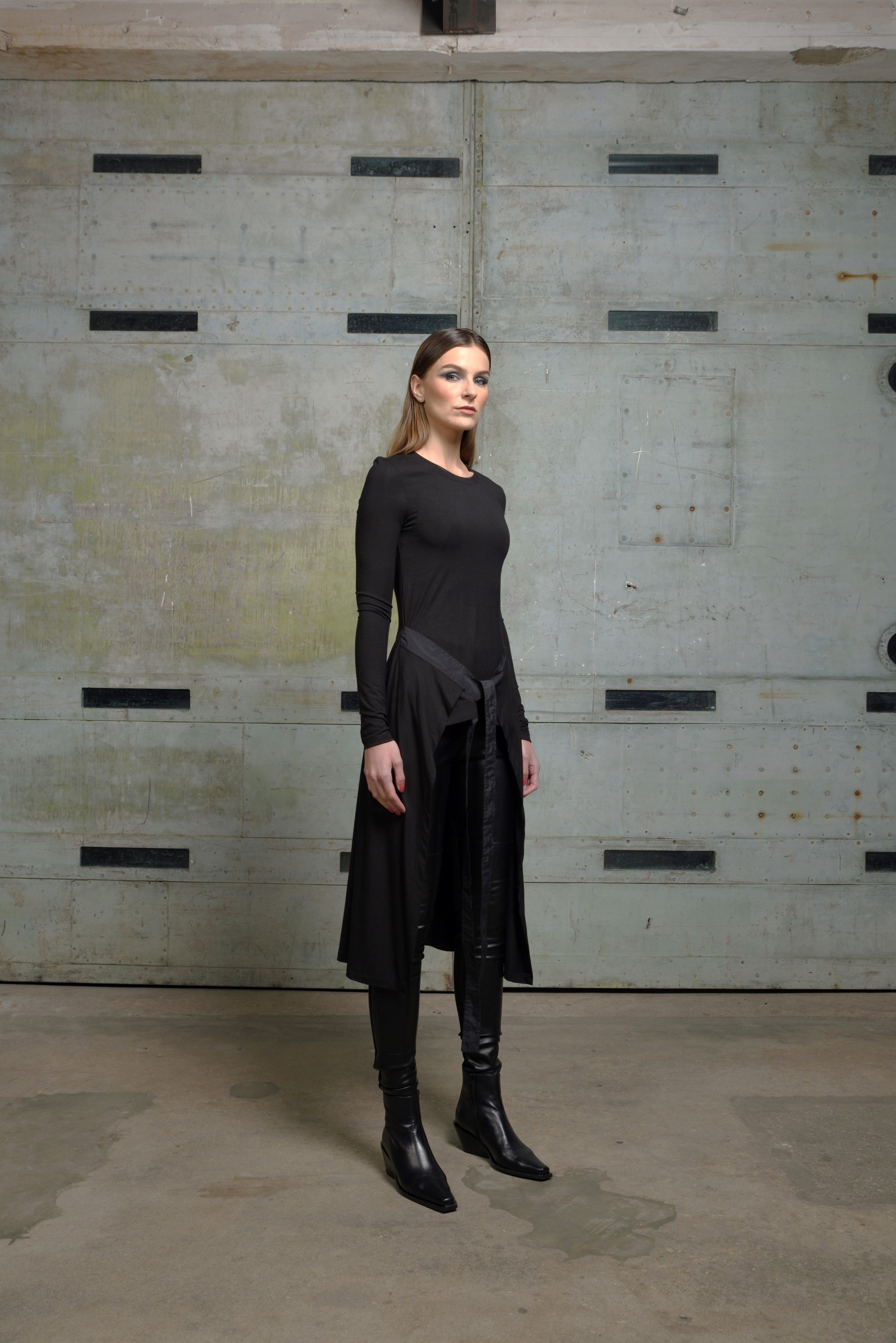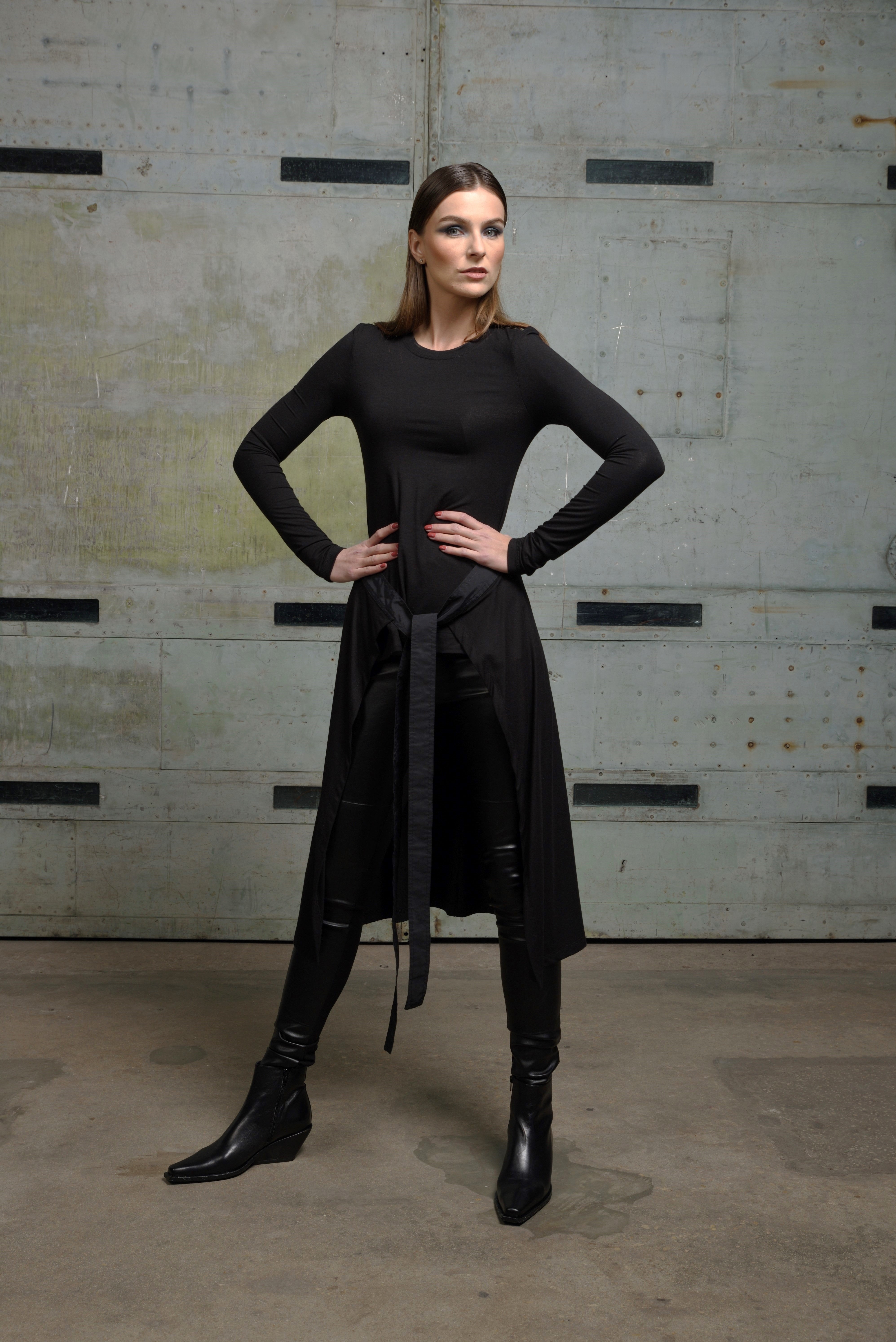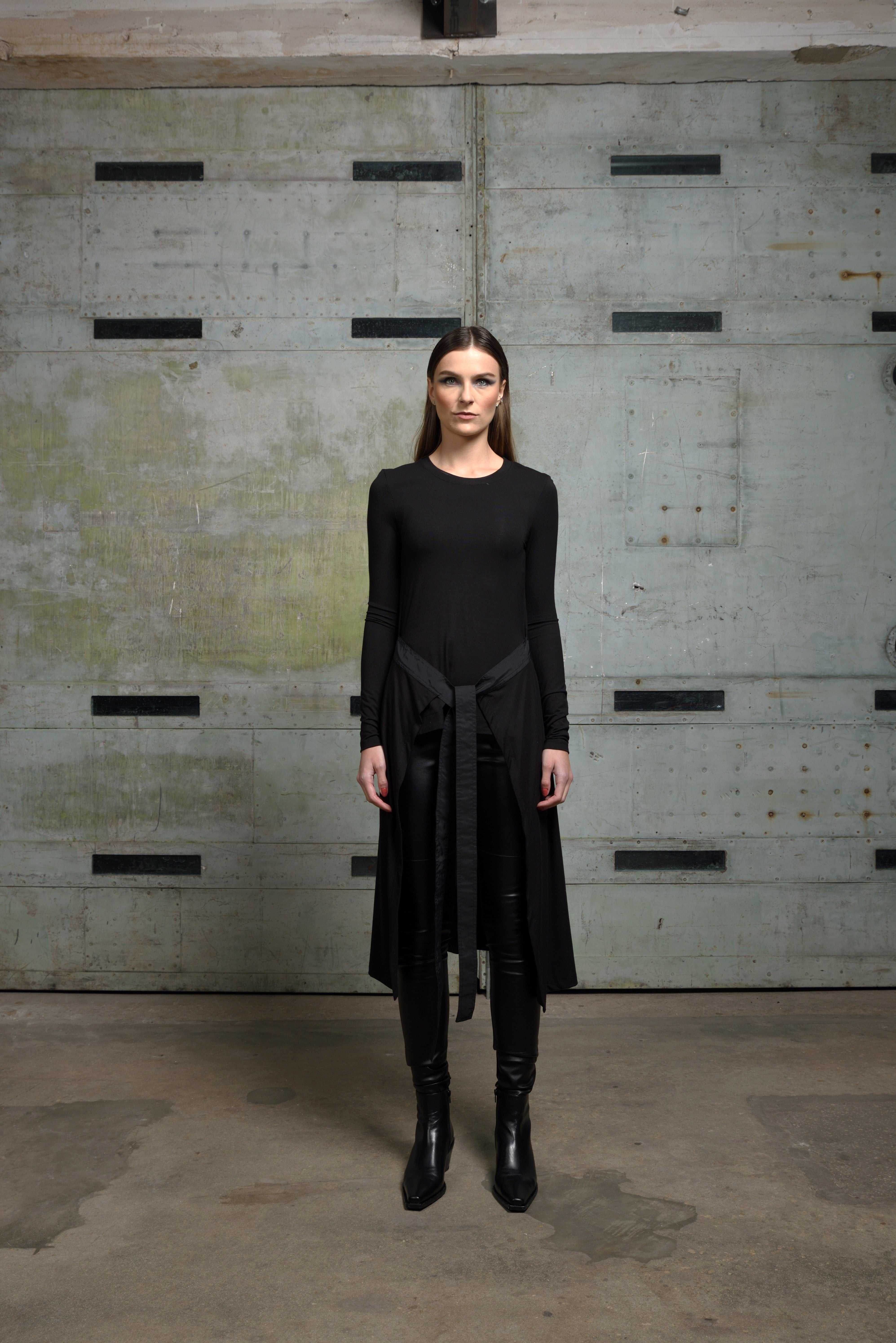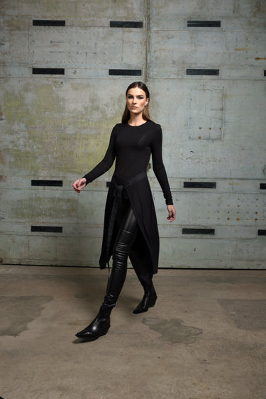 This jet-black knit top delivers drama, fluidity, and form. Designed with a sleek, body-contouring silhouette and exaggerated asymmetrical hemline, it creates effortless movement with every step. The built-in tie detail adds layered dimension—cinch it or let it drape for a sculpted yet relaxed finish.