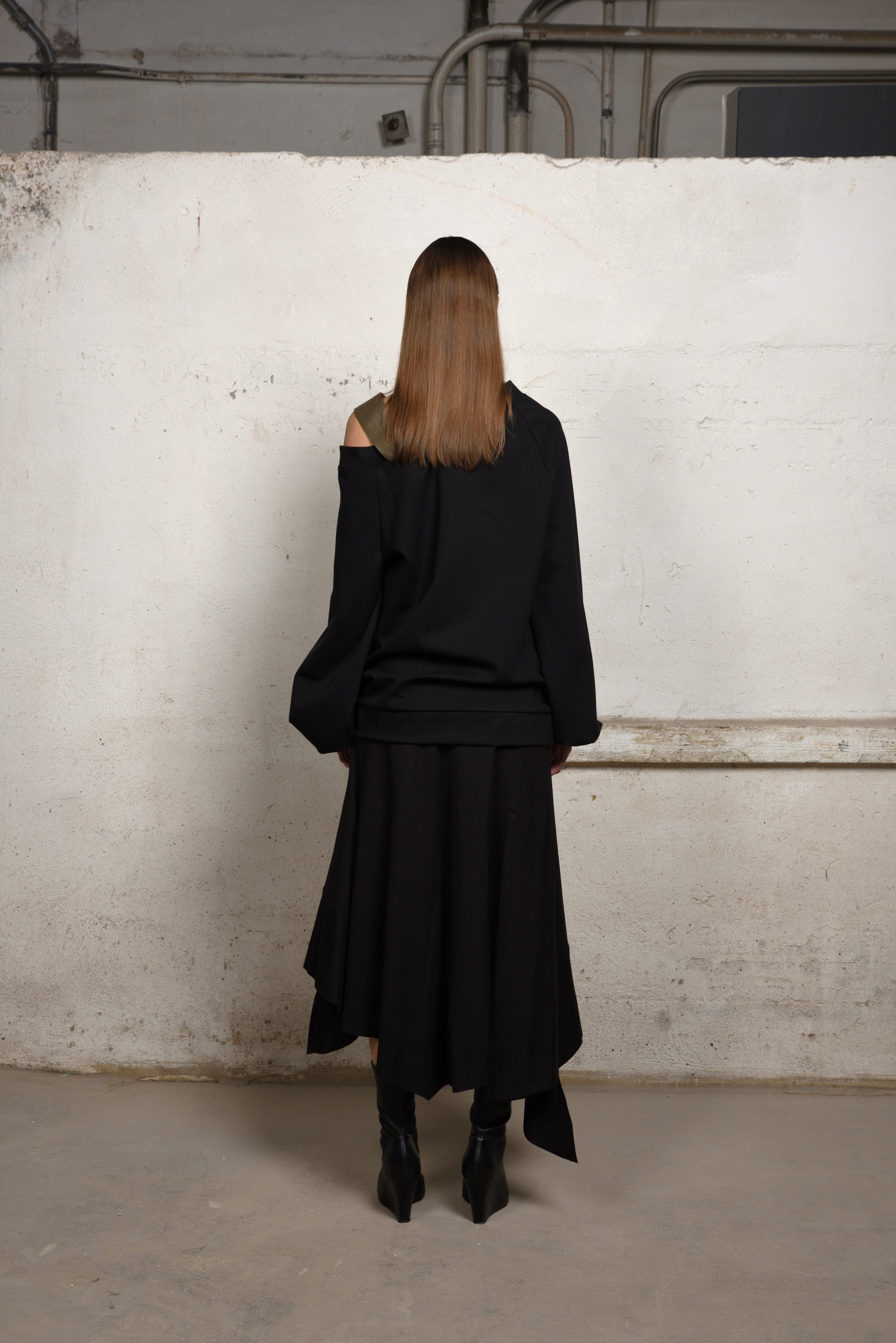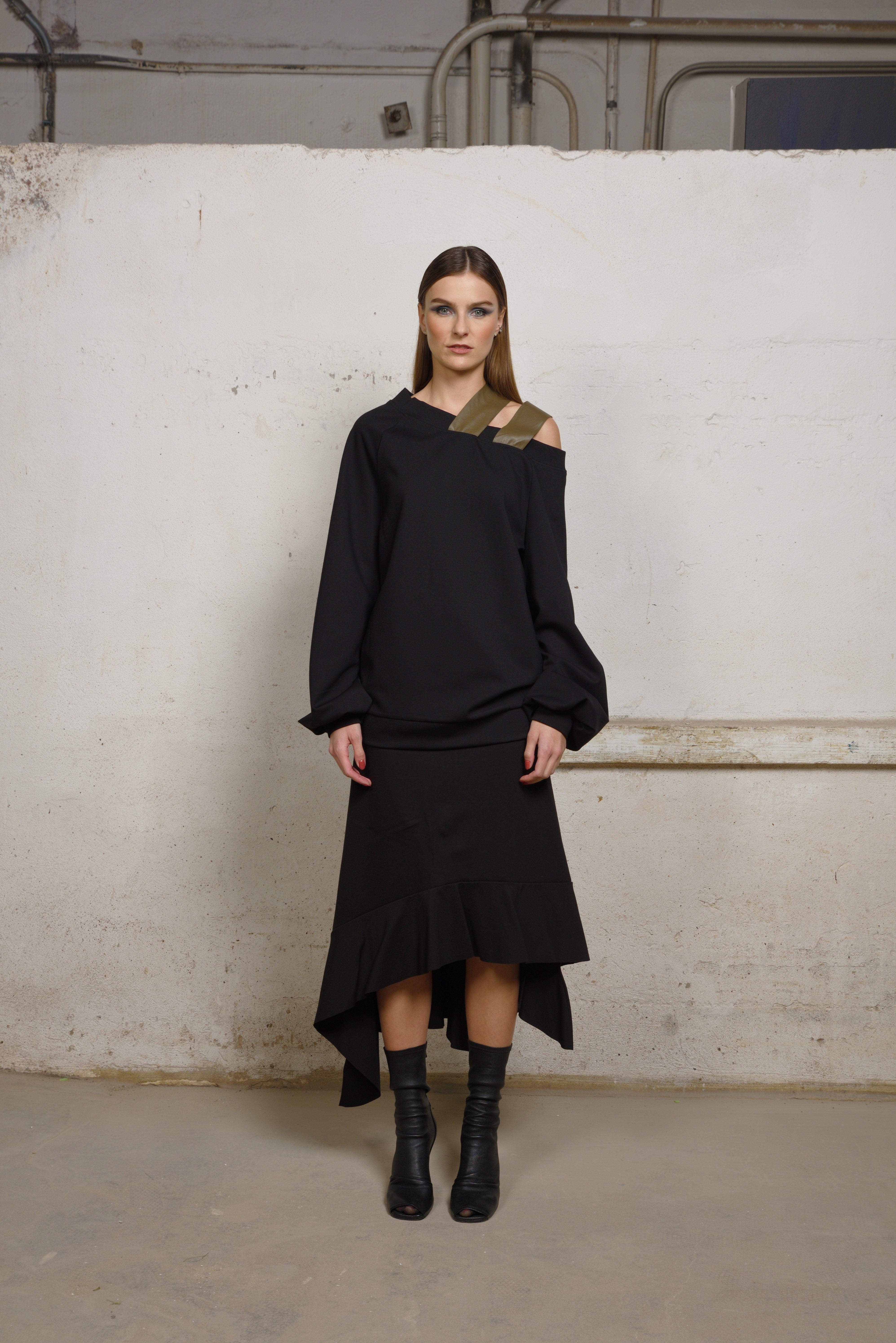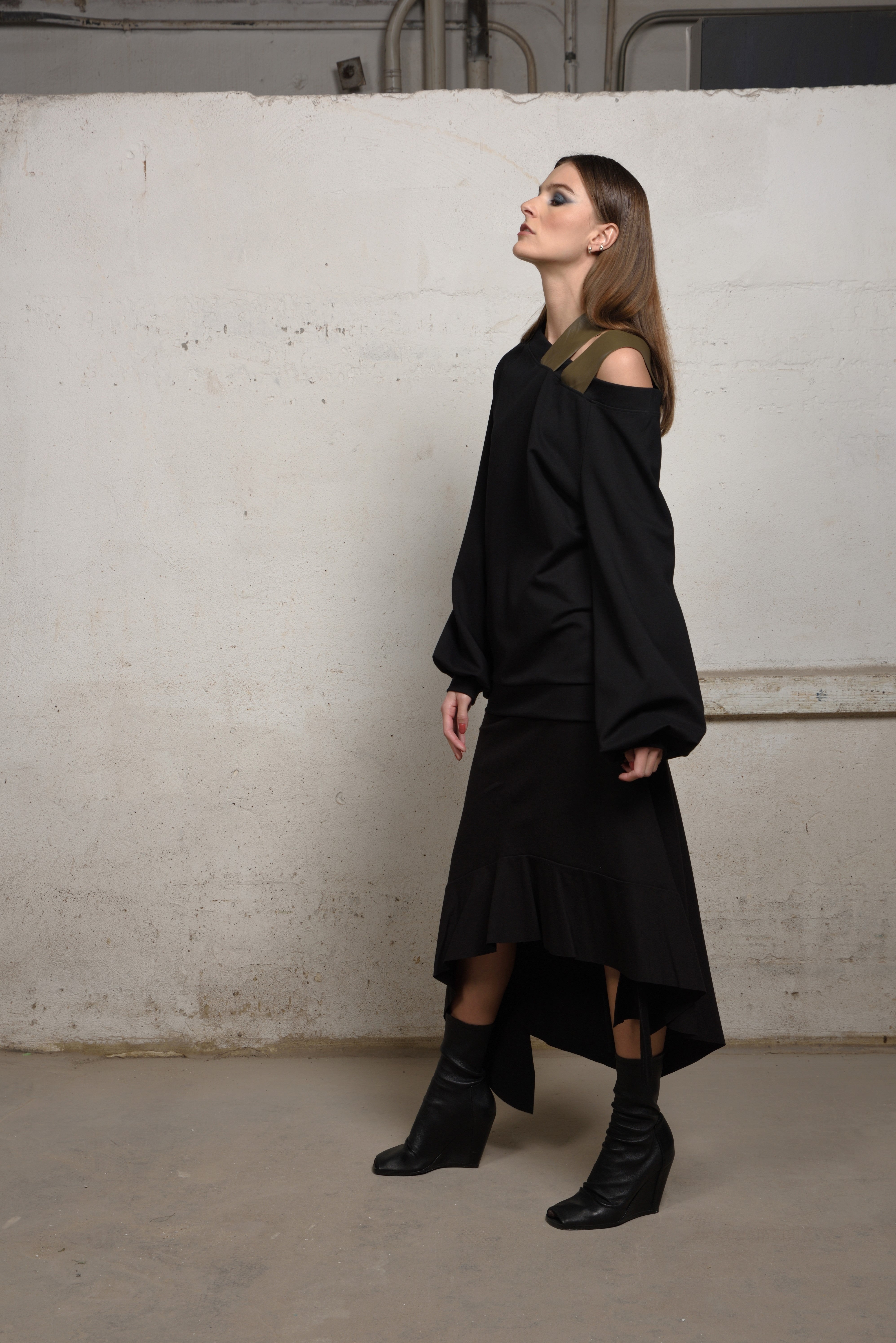 Make a bold yet refined statement in this avant-garde asymmetric sweater. Crafted in a soft structured knit, this oversized silhouette is elevated by its off-the-shoulder neckline and unexpected double strap detail — adding an industrial edge to its minimalist form.