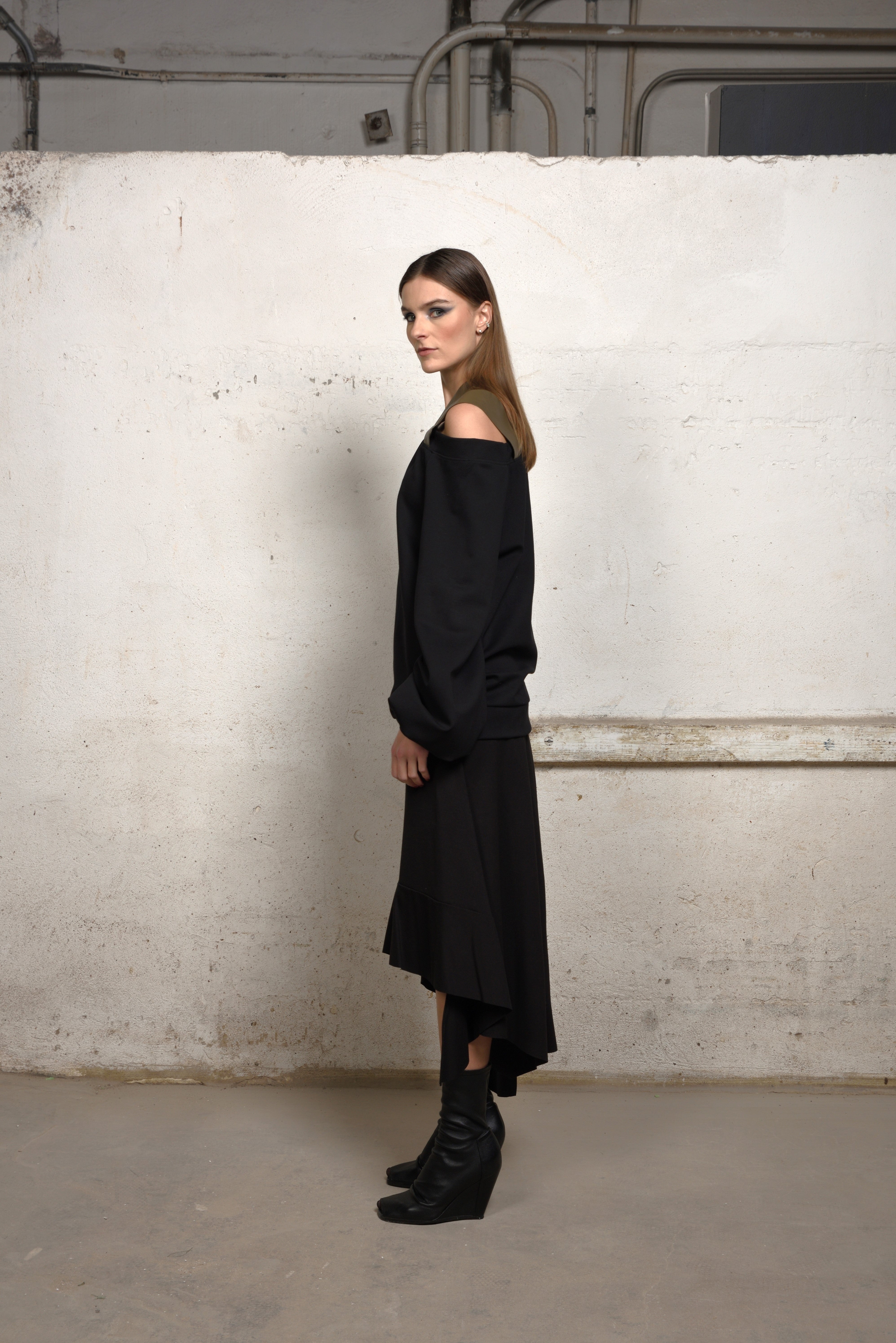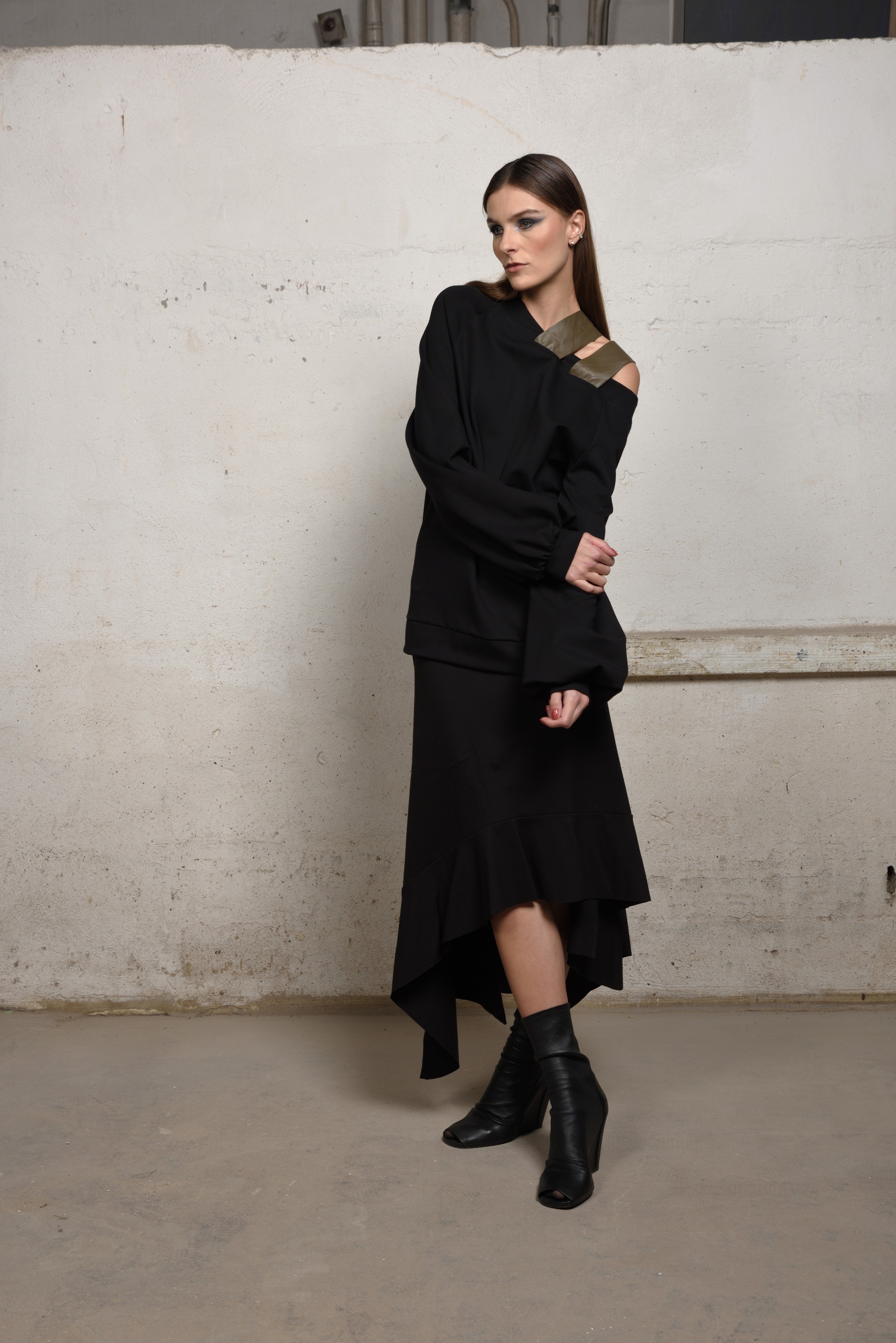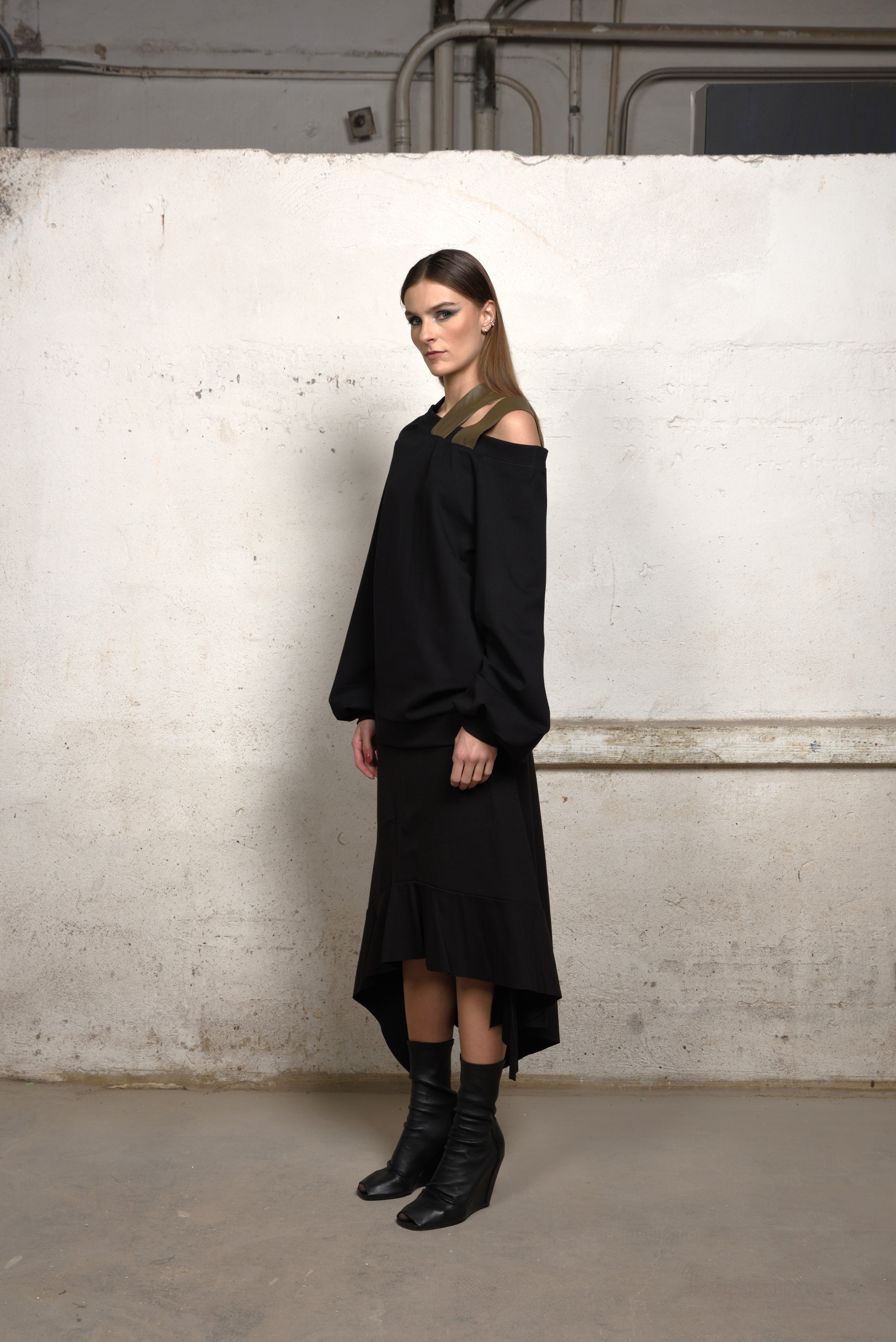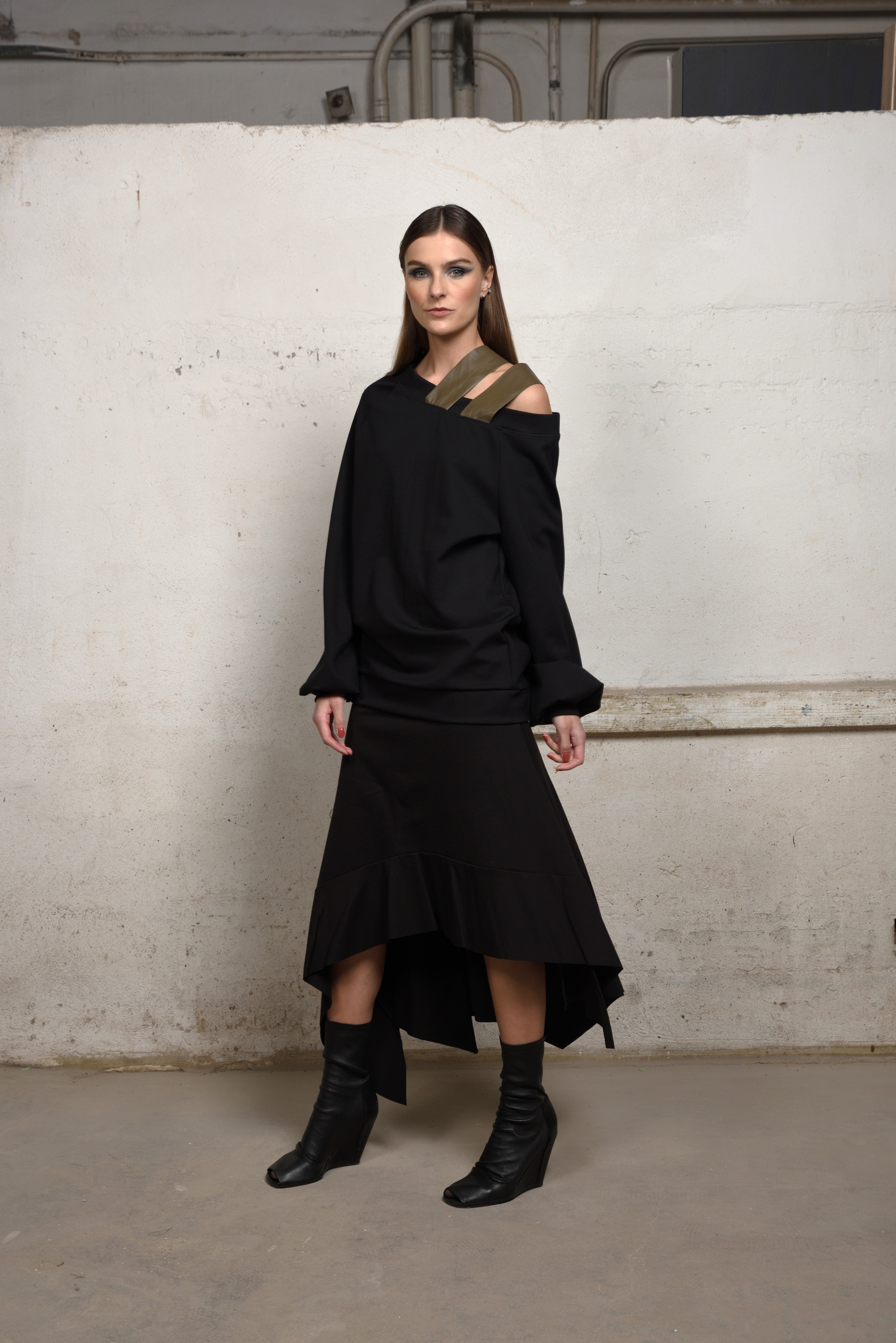 Make a bold yet refined statement in this avant-garde asymmetric sweater. Crafted in a soft structured knit, this oversized silhouette is elevated by its off-the-shoulder neckline and unexpected double strap detail — adding an industrial edge to its minimalist form.