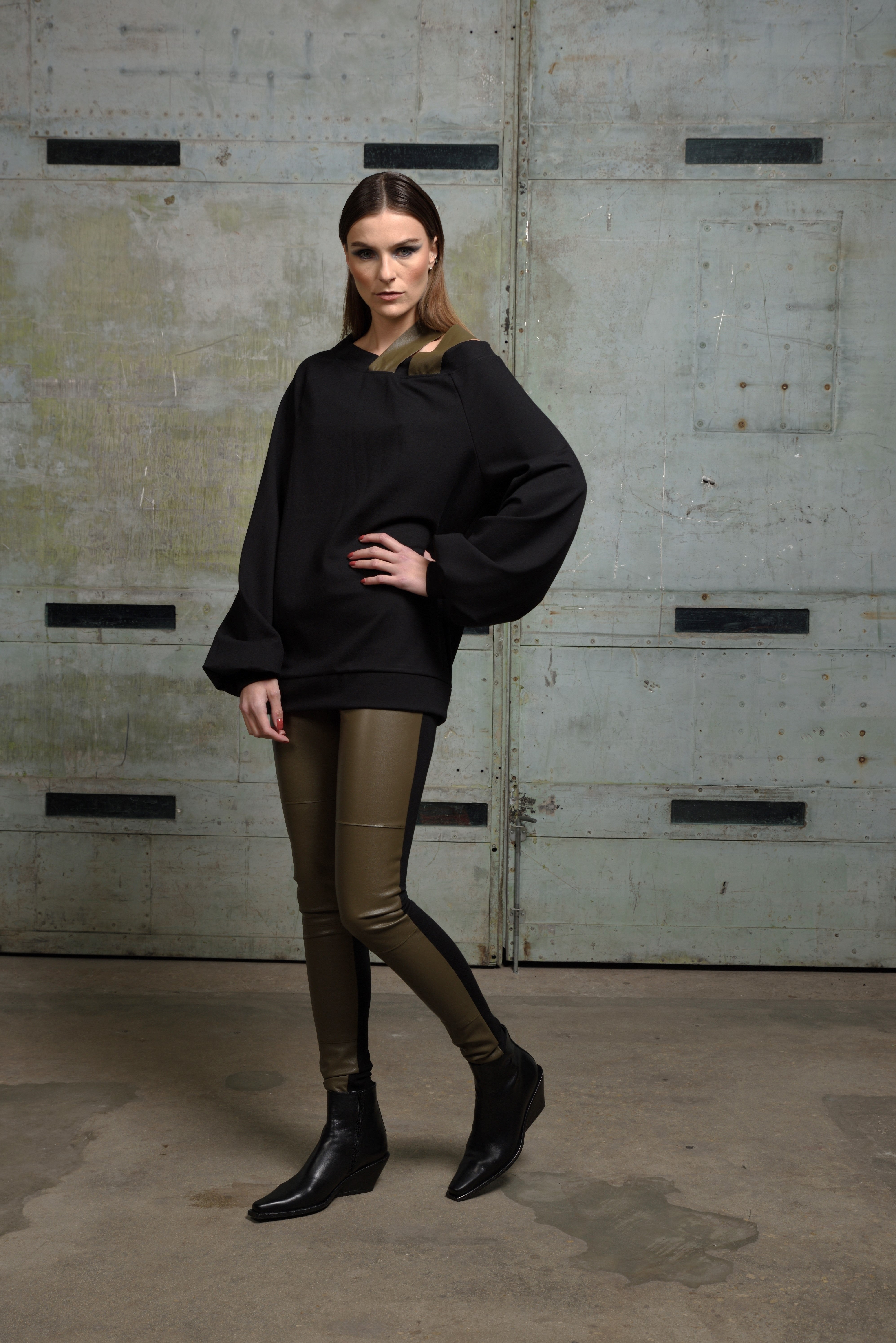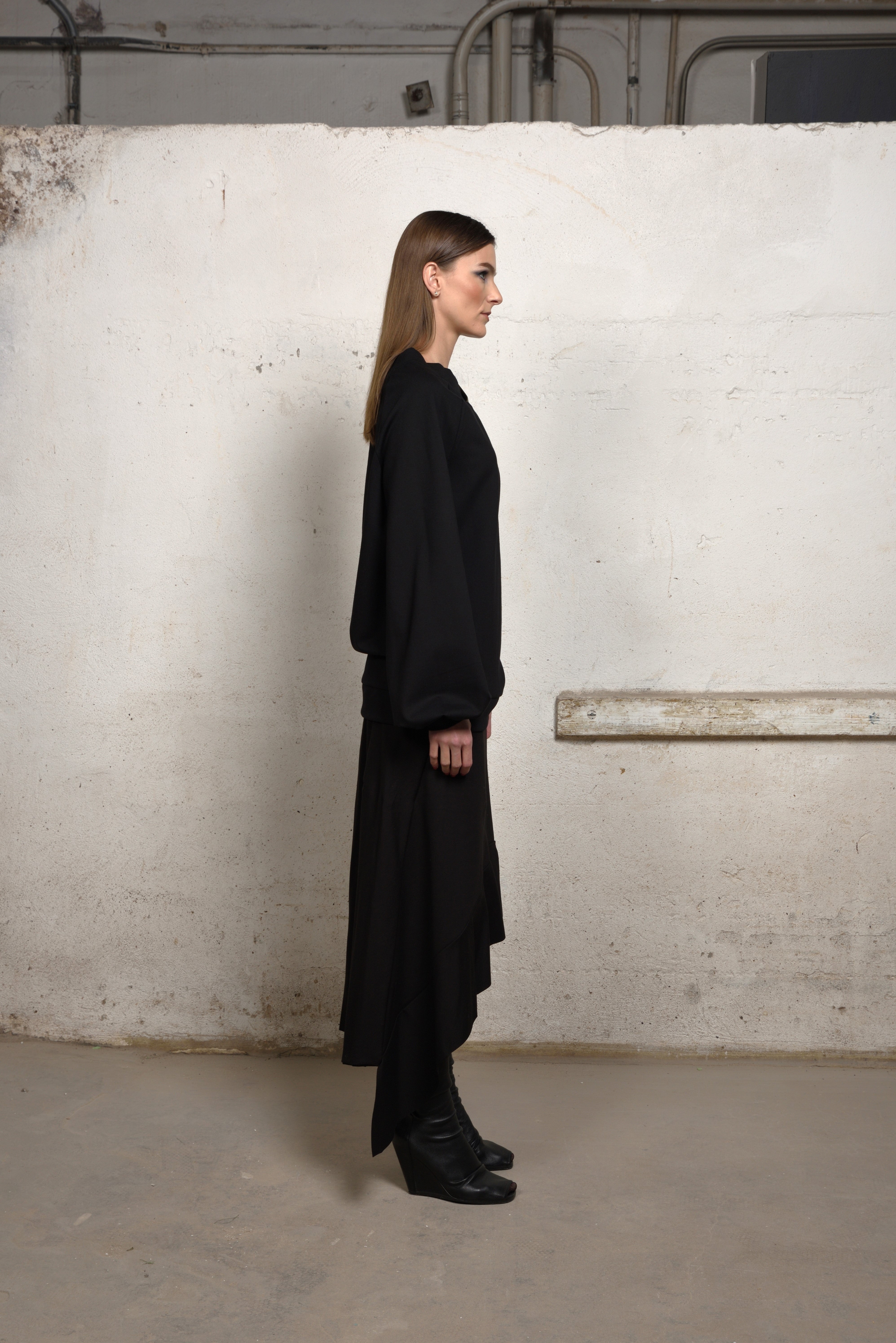 Voluminous balloon sleeves and subtle draping through the body enhance its modern, sculptural profile, while the relaxed hemline makes it ideal for pairing with high-waisted skirts or tailored pants. Whether styled alone or layered, this piece turns simplicity into statement.